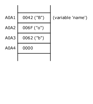 As we can see the string "Bob" is stored at address B000 and occupies 4 memory cells.